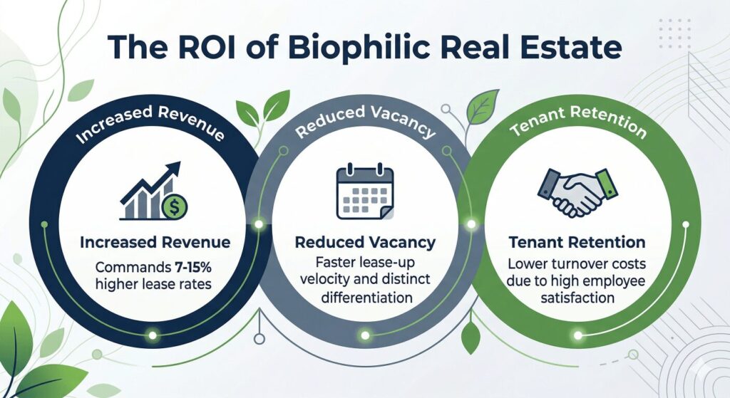 Tenants are willing to pay a premium for spaces that help them solve their HR problems. According to studies published in the Journal of Real Estate Research, commercial spaces featuring high-end biophilic design, ample natural light, and green amenities command lease rates that are 7% to 15% higher than comparable buildings in the same submarket without these features.